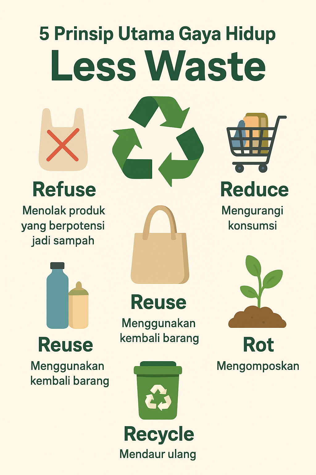Artikel ini akan membahas 5 prinsip utama less waste yang mudah diterapkan siapa saja. Cocok untuk kamu yang ingin memulai kebiasaan ramah lingkungan dan mencari tips praktis yang bisa diterapkan setiap hari. 🌱